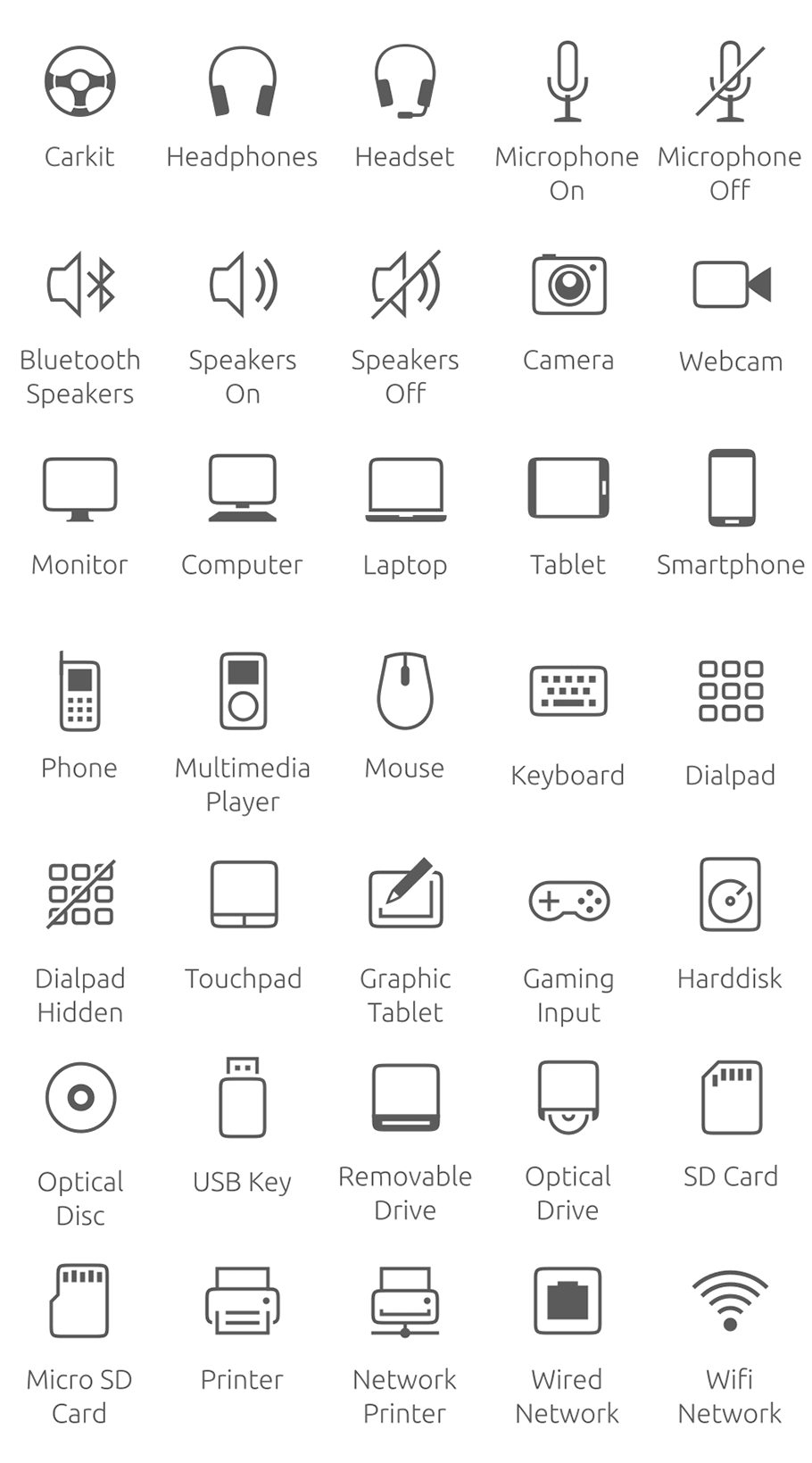 At the moment, if you compare the Suru icon theme to the symbolic mono icons in Gnome, or to the Humanity devices icons, a few icons are missing, so you should expect to see this set expand at some point in the future — but the most common devices are covered.