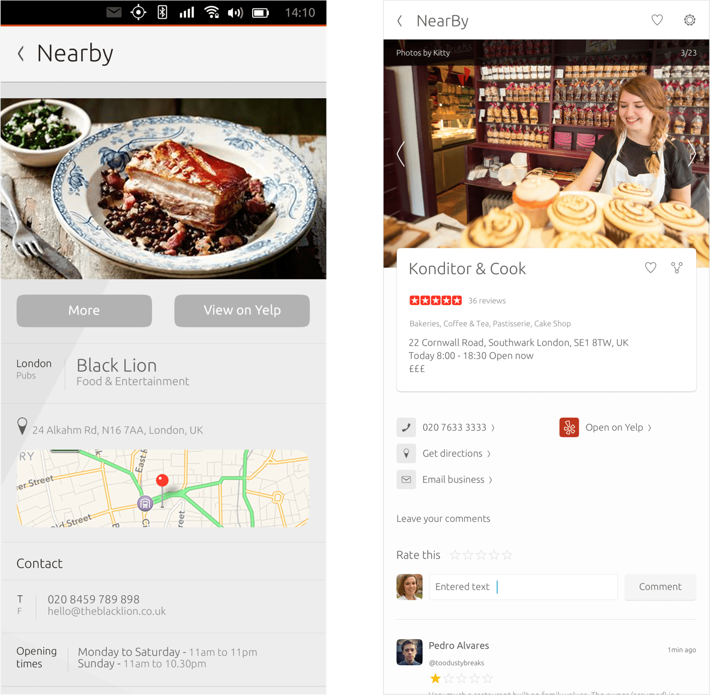 The previous design of the Nearby scope (left) and the updated design using the new palette (right) The background is lighter, buttons don’t look as disabled and text is higher contrast against the background.