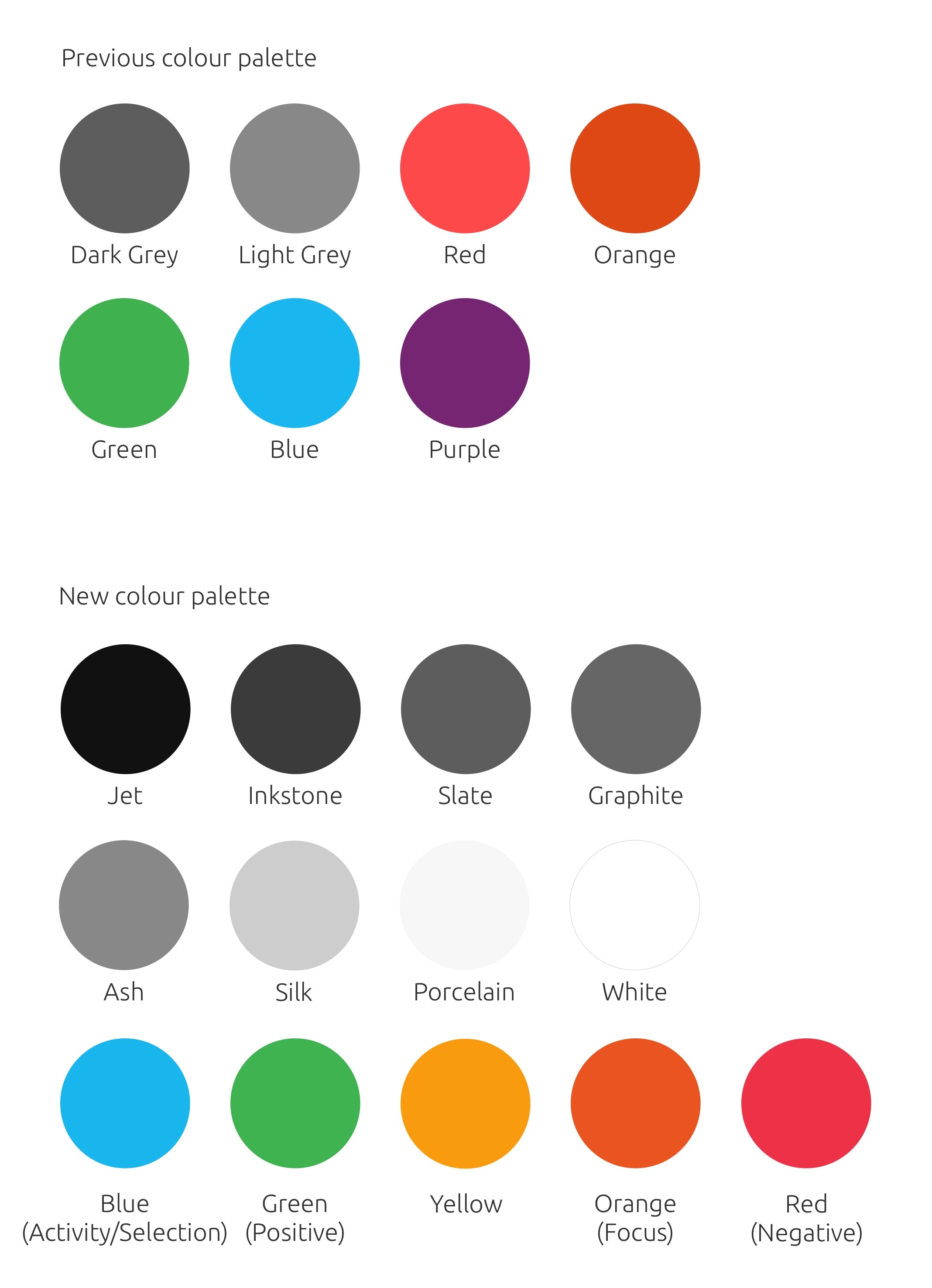 How we came to choose the colours was by iteratively reworking the visual designs across the whole platform and discovering what was needed as we designed. The greys came about when we worked on the revamped dark theme and shell projects, for example the upcoming contextual menus. While we added several new greys, the UI itself has taken on a less grey look.