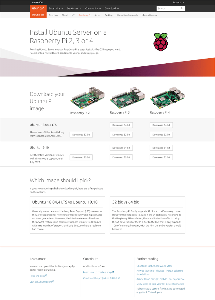 With the 18.04.4 release, we updated the Raspberry Pi download page to make it easier to find the right version of Ubuntu to use. We also move the instructions to the thank-you page with more details on verifying checksums, how to flash your microSD card and more.