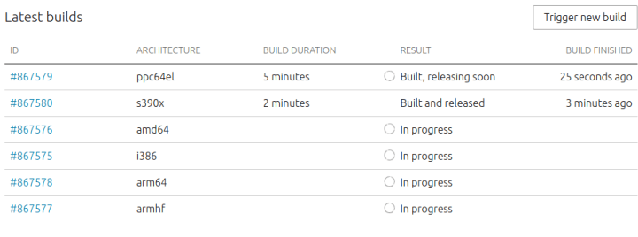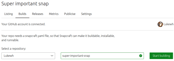 If you’ve got a Snap name registered, you can visit the new “Builds” tab to connect a GitHub repo. A build will be triggered when you first connect your snap, subsequent builds happen when you either click the “Trigger new build” button (see below), or you push code to the master branch of your GitHub repository.