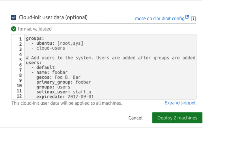 We are happy to inform you that cloud-init configuration via user data will be part of the UI for this cycle. However, we are on the verge of finalising the design. As part of our scope, this feature will be added to the UI for feature parity with our MAAS API. The feature includes: