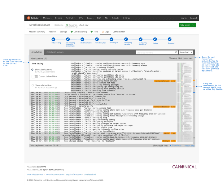 Here is a little preview of the future of our logs in MAAS. After discovering some flaws in the previous design, we have revisited a few places that our users struggled with during our testing session. We have added an accelerator for the logs using the map and colour indication on the scrollbar to show a preview of where the closest error/warning is at. We have also regrouped a few components such as the time functionality and the search functionality to closer proximity to our target area (terminal) in order to reduce delay in the interaction. We are still working on the final version of this log and waiting for feedback from the team going forward.