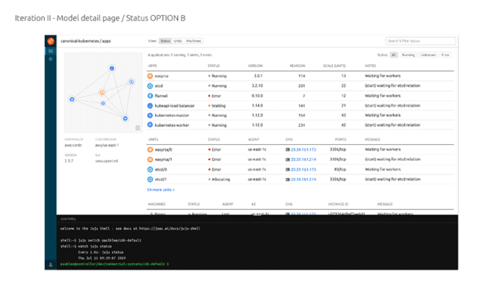 The option B is with the current model status displays apps, units, machines and relations, but the number of displayed units and machines is limited: “54 more units” in the example would open the units view (that can be accessed from the “status | units | machines” on top, too)