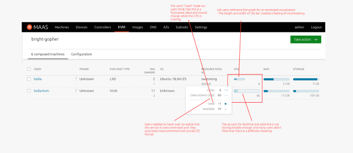 The main question was did people understand the representation of overcommitted values. Many needed to view the tooltip on hover to understand what the different borders represented.