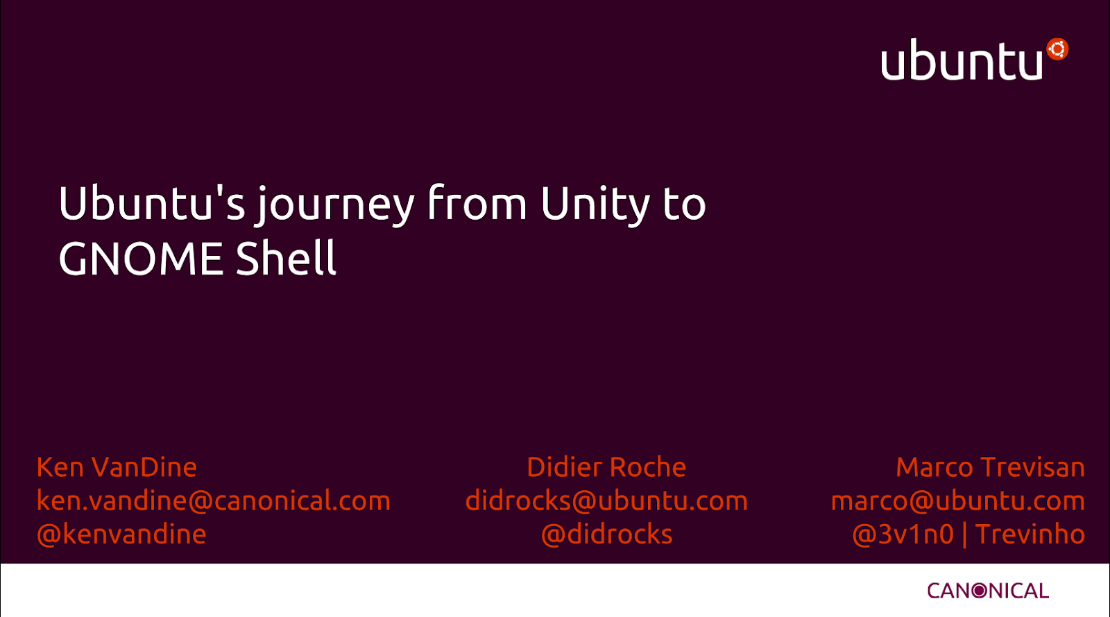 Ken, Didier and Marco gave a summary of the Ubuntu journey going from our Unity desktop to a GNOME one. The session was well attended and followed by questions.