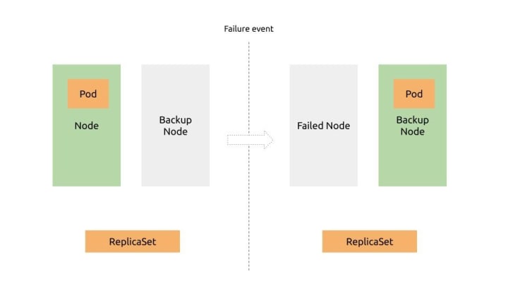 ReplicaSets may be used for backing up mission-critical devices. In this schema, a worker node running a critical workload would be backed up with an additional one running in idle. In case of failure, the ReplicaSet in the master node would reschedule the workload on the backup. This redundancy would reduce the probability of unavailability of critical workloads.