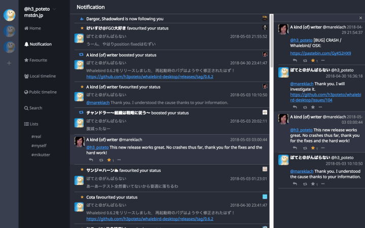 Toot! Toot! Whalebird is an elegant Mastodon client for the desktop that supports multiple accounts and various views of your timeline.