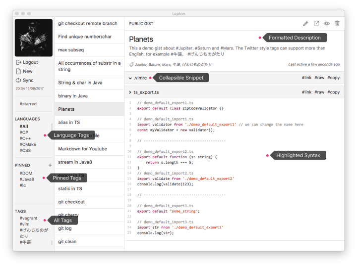 Lepton is a beautiful open source snippet manager for Linux. Manage your Github gists with support for tags, search and sharing. Lepton features a rich-text editor and markdown viewer! Get Lepton from the Snap store or install it on the command-line with: