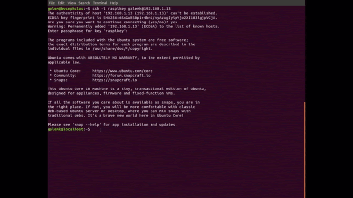 Once the board setup has completed, Ubuntu Core will display the network IP address of the board. You can then use your key and your Ubuntu SSO ID to access your board from your development PC. You will be asked to authenticate your board and to enter a passphrase for your key. These actions will log you into your Raspberry Pi running Ubuntu Core. Welcome!