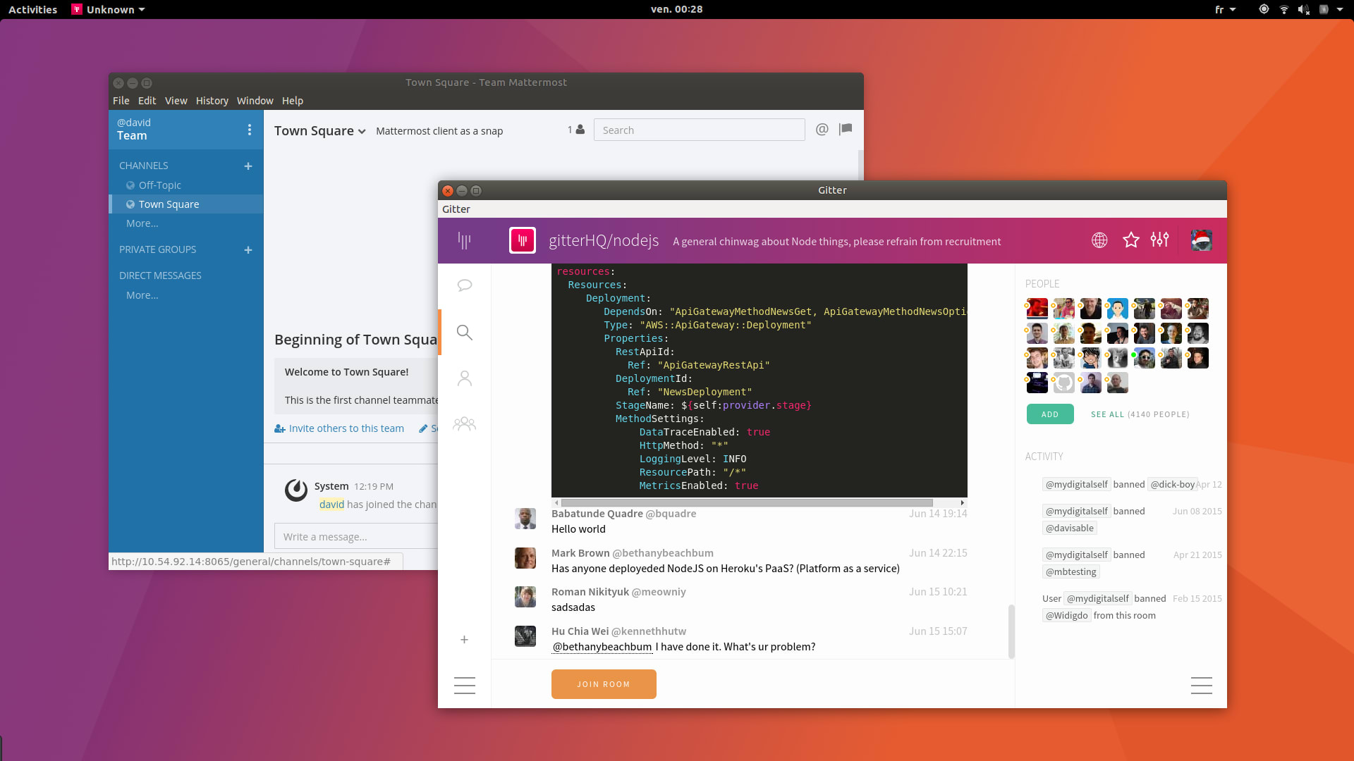As of today, if you are a Mattermost or Gitter user, you can install their respective desktop client as snaps on all supported Linux distributions (including Fedora, openSUSE, Debian…).