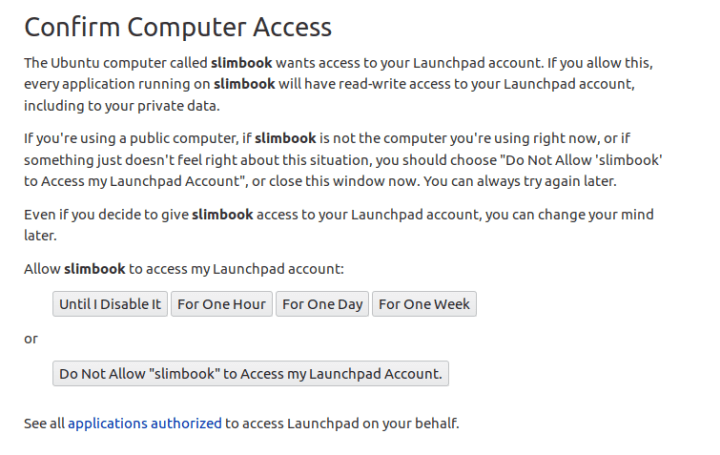(https://launchpad.net/+authorize-token?oauth_token=swT6JPJhMZwz0ztrb6X8&allow_permission=DESKTOP_INTEGRATION) should be opening in your browser. Use your browser to authorize this program to access Launchpad on your behalf.