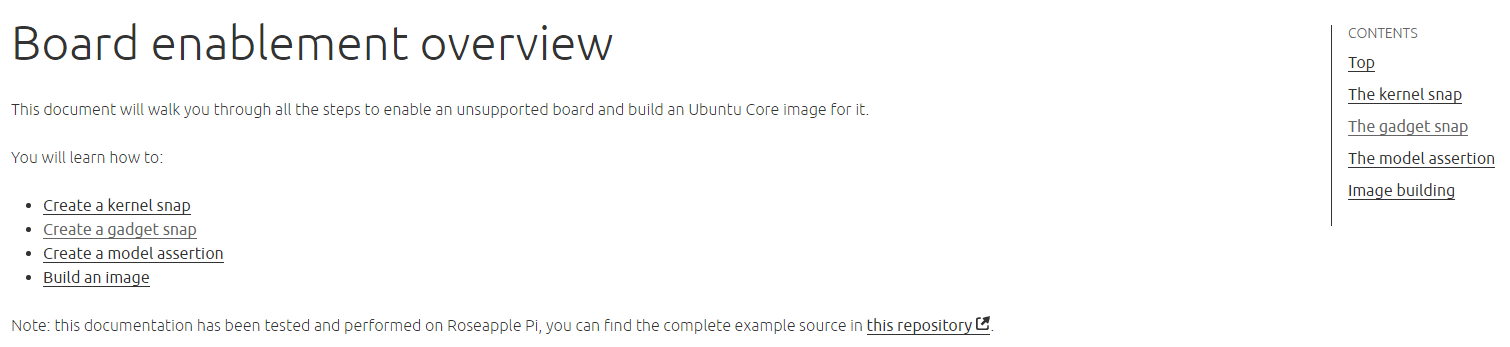 The new Board enablement documentation gives a set of instructions for advanced users to help them enable new boards and build images, including kernel building, gadget snap composition, signature generation and model assertion creation.