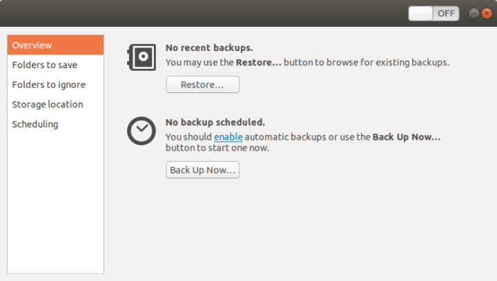 - Ubuntu has its own backup tool, which you can turn on.