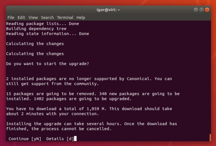 If you are not comfortable with this path, it is best to continue running Ubuntu 18.04 LTS until the availability of the upgrade offer through the update manager. The sequence of actions below requires some familiarity with the command-line usage, so it’s best suited for people like developers, administrators or more skilled techies.