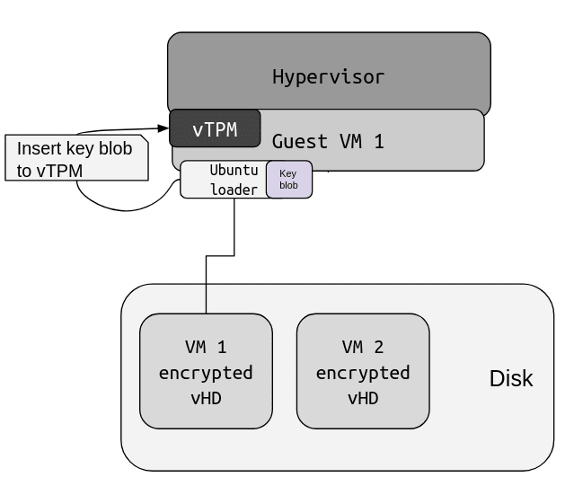 During boot time, Ubuntu’s early boot environment (initrd) loads the key blob into the vTPM, and then, in turn, loads the kernel and attests that it is in a specific state before the vTPM makes the VM decryption keys accessible. The decryption keys can only be read by this VM. A simplified view of this process is shown in the following diagrams.