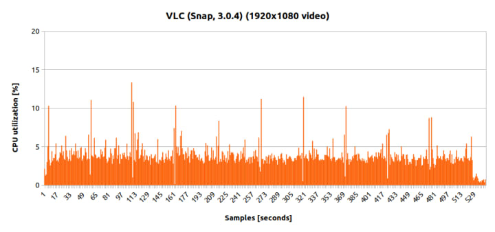 We had the program launched from the command line, playing a video file and then exiting (with the –play-and-exit flag). The full VLC version was used (the vlc binary and not cvlc). The player was launched 10 times in a for loop, with a 2-second pause in between each iteration. We did this a total of four times, twice with the standard VLC and twice with the snap VLC, once each against a 640×480 30FPS WebM video (vp8 and vorbis codecs) and once against a 1920×1080 30FPS WebM file, respectively.