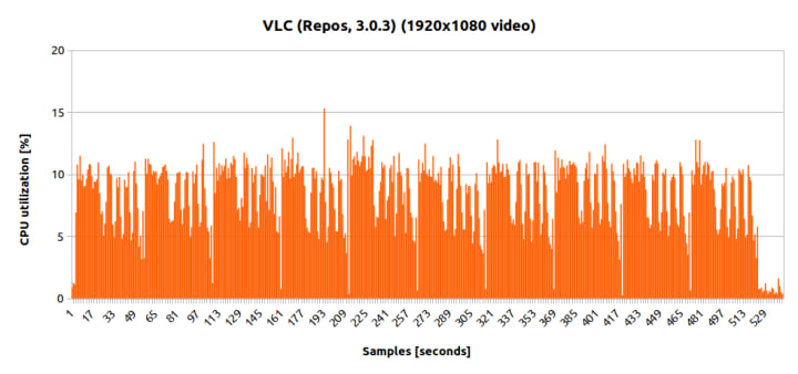 Another important point to mention is that during the runtime, the snap version of VLC printed out a message onto the standard output about the use of hardware acceleration. There was no such message for the repo-provided VLC 3.0.3. As this would explain the CPU differences, we tested the snap package without hardware acceleration (through the application options), and the CPU values were in the order of about 50%, identical to the DEB package.