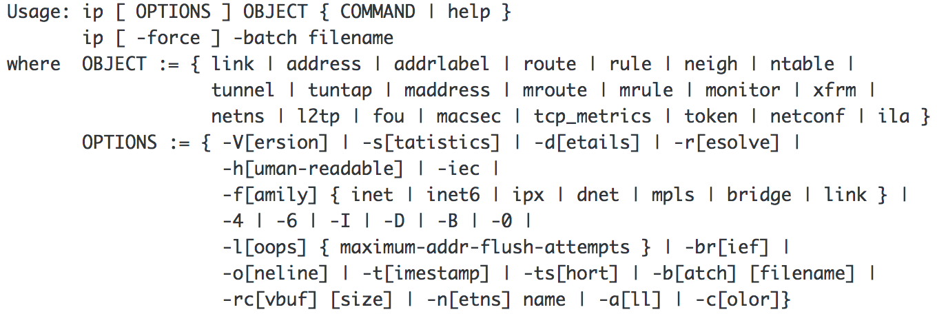 As shown above, there are lots of other objects that can be interacted with using the ip command. I’ll cover another: ip route, in another post.