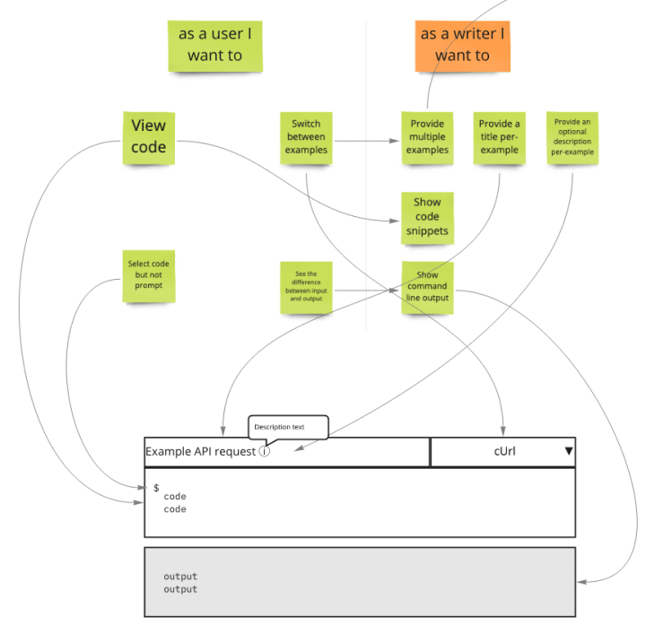 We undertook some research into the user stories surrounding code snippets, including benchmarking other documentation sites and talking to users.