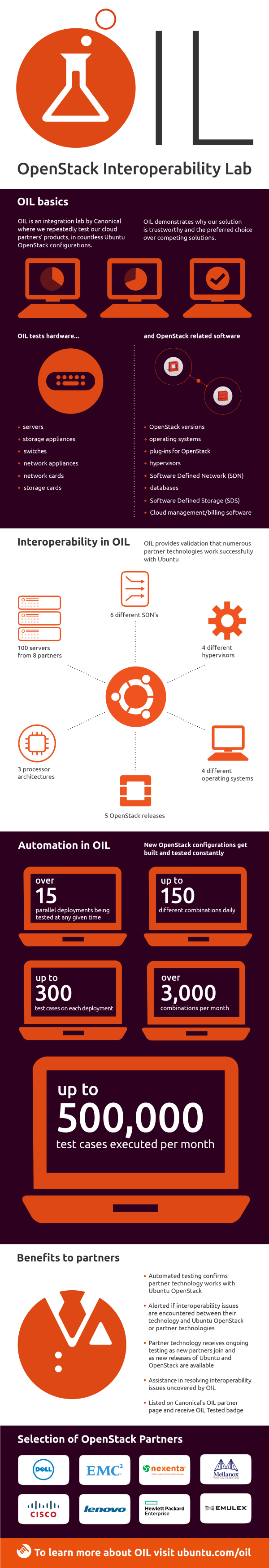 OIL (short for OpenStack Interoperability Lab) is an integration lab by Canonical, where we repeatedly test our cloud partners’ products, in countless Ubuntu OpenStack configurations. OIL demonstrates why our solution is trustworthy and the preferred choice over competing solutions.