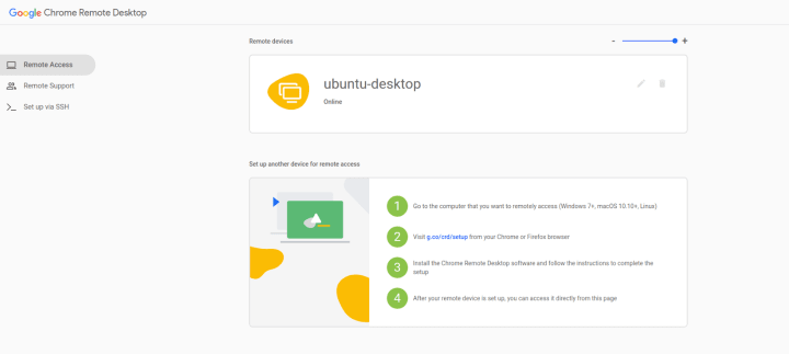 10. On your local computer, go to the Chrome Remote Desktop web site. You will find your Ubuntu Desktop shows up in the portal.