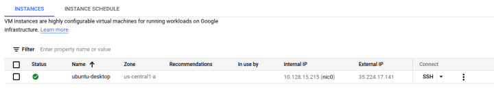 8. In less than one minute, you will be able to see your Ubuntu instance in RUNNING status. You can click the SSH button in the instance list to connect to your new instance.