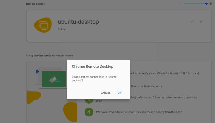 Then on your Google Chrome Remote Desktop, DELETE ubuntu-desktop from your Remote Devices list.