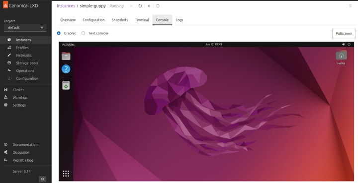 Most of the functionalities surrounding managing instances are now in place. We introduced “Projects” as a feature that helps keep your LXD server clean by grouping related instances together. In addition to isolated instances, each project can also have specific images, profiles, networks, and storage. Users can also easily switch between projects. You can either start, stop, restart or freeze a single instance or a bunch of them at once, as well as access the terminal and the console directly from the UI. The UI also supports snapshots and restoring instances from snapshots. A brief overview of networking and storage is available, as well as a list of current operations.