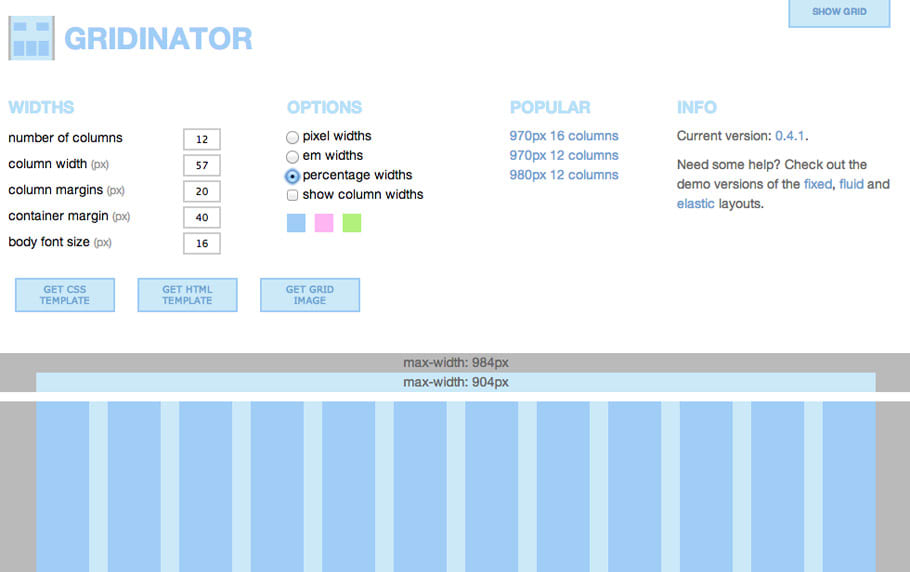 We used Gridinator to initially create our basic grid, removed any unnecessary rules and properties from the CSS it generated and added others we needed.