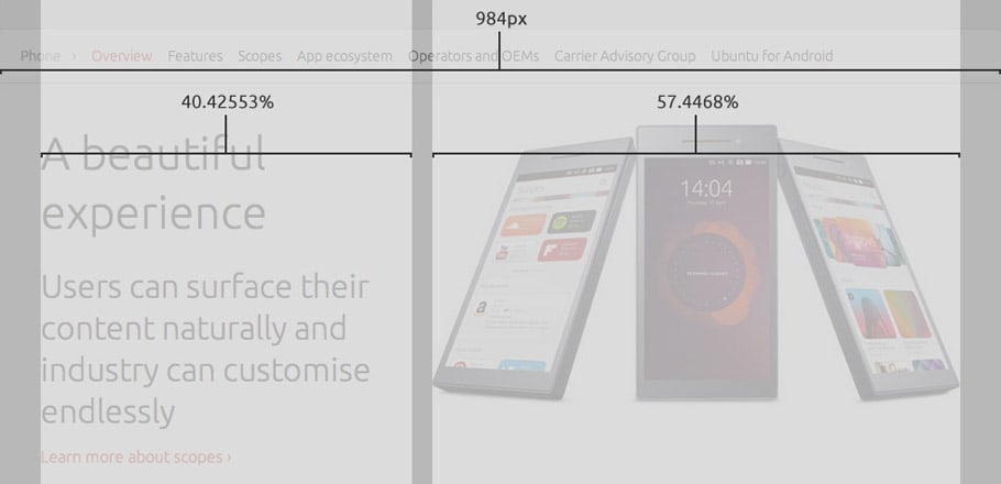 At this scale, following what we had done in Ubuntu Resources (now Ubuntu Insights), we reused the grid from the Ubuntu phone designs, which divides the portrait screen into 40 squares, horizontally.