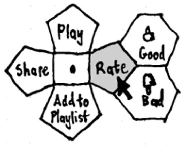 Nested pie menus. These are used in several games, and in the Songza Web site. They’re typically invoked by a secondary click, where menus fan out from the cursor position. With simple, icon-based menus the pie arrangement is rapid to use, because menu selection gestures can be learned and repeated. With more complex menus, though, it quickly becomes unworkable to present the text of pie menu items in a compact and readable way.