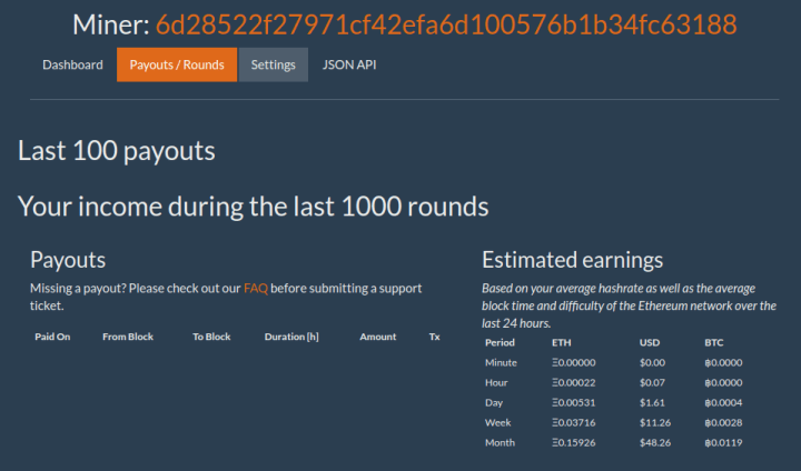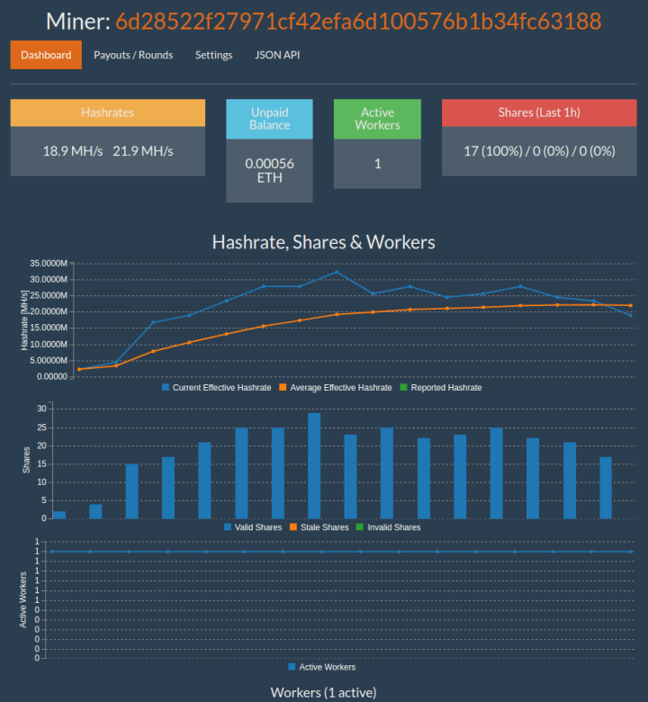 After a short time, my miner page on ethermine.org showed up and started getting filled in with statistics: