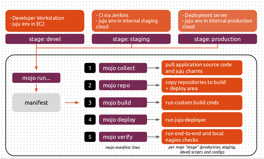 mojo run --stage=production - manifest: collect => collect resources as defined in "production/collect" repo => create charm repository as defined in "production/repo" build => run custom build commands per "production/build" deploy config=services-and-relations => deploy using "juju deployer -c production/services-and-relations" verify => run the "production/verify" script include config=manifest-content-update => run any steps defined in manifest-content-update, which are: script config=content-update => run the "production/content-update" script sleep config=60 => sleep for 60 seconds verify => run the "production/verify" script