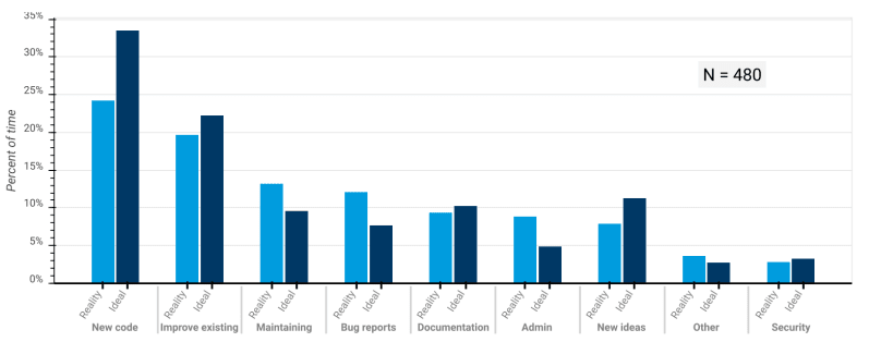 Take for instance the Report on the 2020 Free Open Source Software (FOSS) Contributor Survey [4]. With a total of 1,196 respondents from the most widely used open source projects, it found that respondents spend very little time on responding to security issues; an average of 2.27% of their total time spent working on their project. Moreover, the respondents do not report a desire to increase this significantly; in fact, the average time they would like to spend on security was only 0.06% higher. Some respondent comments, such as “I find security an insufferably boring procedural hindrance”, clearly illustrate this concerning situation.