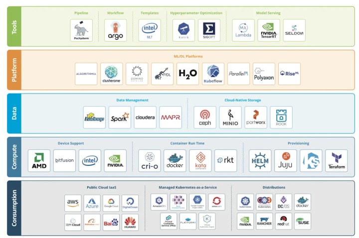 The landscape describes multiple verticals, such as tools, ML platforms, data management storage, compute, and consumption space. Most of these services are in the open-source space. Below are examples of projects that contribute to the ML infrastructure.