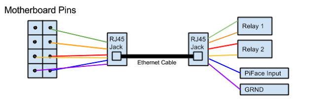 The prototype had jumpers cabled directly from the pins to the Pi but I wanted to be able to unplug the computers from the Pi and have them some distance apart so I used Ethernet cables to connect the Pi to the computers pins. Essentially the solution looks like this…