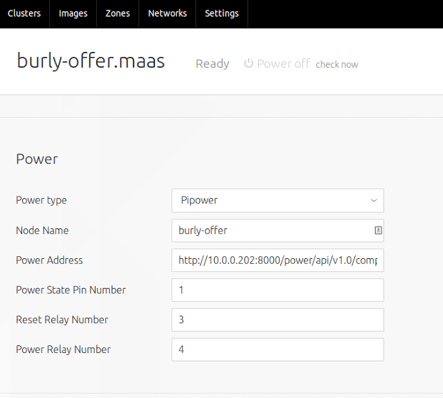 Once everything was connected, MAAS needs a way to remotely control the relays and to check the state of the input pins. I began by writing a Python library and then adding a REST interface that MAAS could call. Finally I installed gunicorn to run the server.
