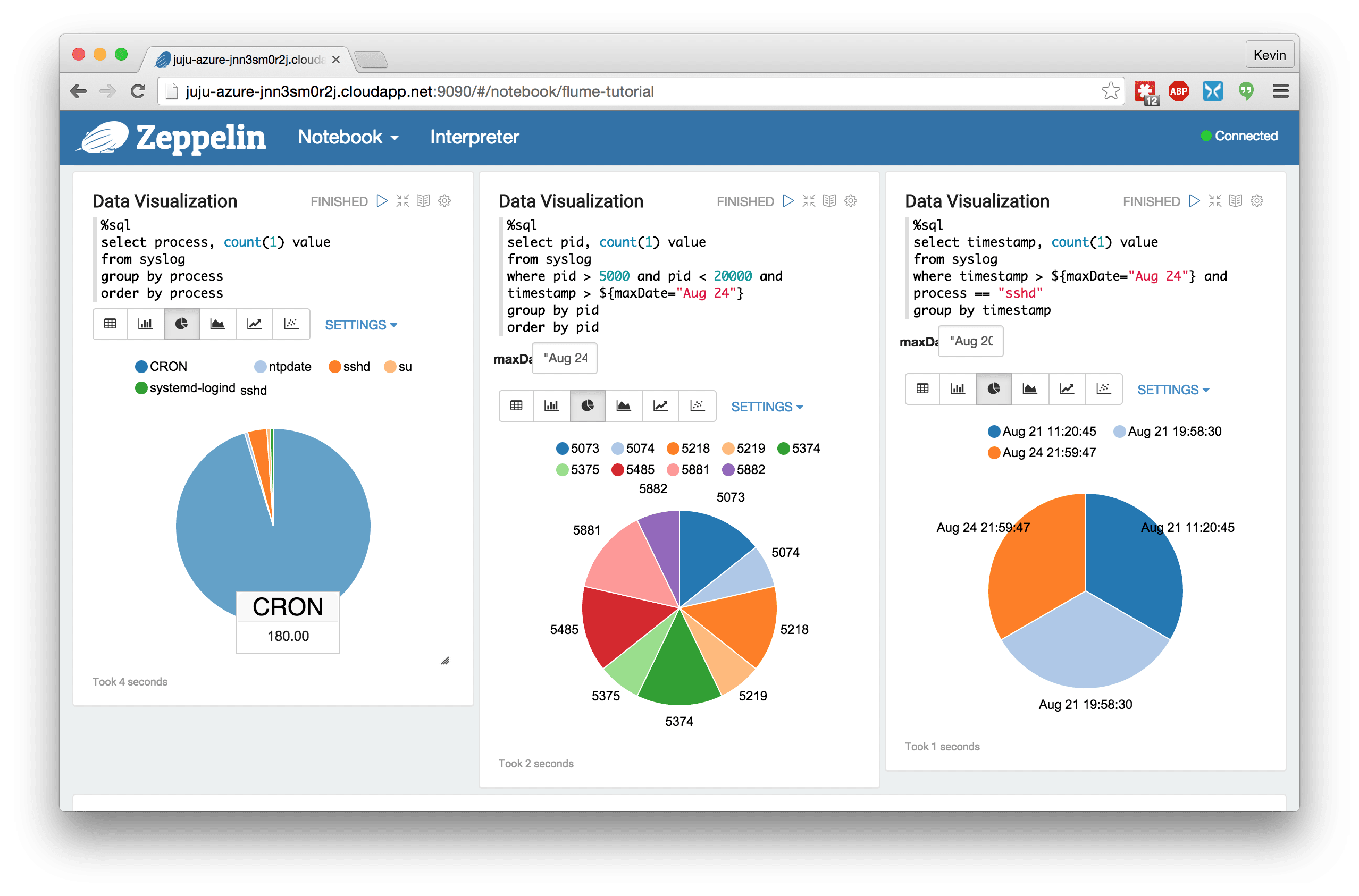 We’ve included another service that I haven’t mentioned yet: Apache Zeppelin. It’s a web-based notebook that offers a simple way to submit jobs and interact with your data using Spark (among other things). We provide a sample notebook in the Zeppelin charm to analyze the syslog events captured by this bundle. Once you have this deployed, see Zeppelin in action at http://<spark_unit_ip_address>:9090
