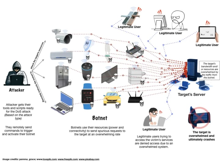 A Denial of Service attack (DoS attack) is a cyber-attack in which the attacker looks to make unavailable machines or network resources to its final users by interrupting the device’s normal functioning. The infinite loop is what allows attackers to flood the targeted machine or resource with superfluous requests, overloading systems and prevent some or all legitimate requests from being fulfilled. Imagine that you have a group of people crowding the entry door of your shop, making it hard for your legitimate customers to enter, thus disrupting trade.