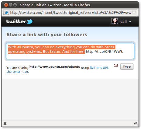 Sharing your favourite pages of the Ubuntu website on Twitter is a breeze. Before tweeting, you can customise your message too.