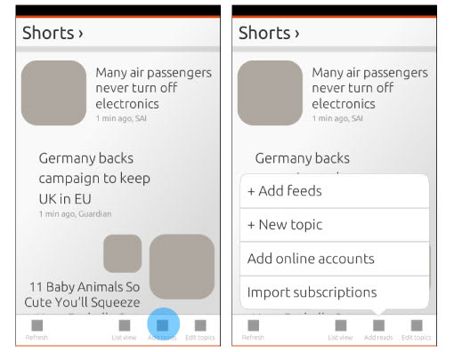 There are different options for adding content to the Shorts app. All of the options described here are for when the user already has feed subscriptions in the app; the first use scenario is not yet covered. To get to the different options for adding content, pull up the toolbar from the topic view: