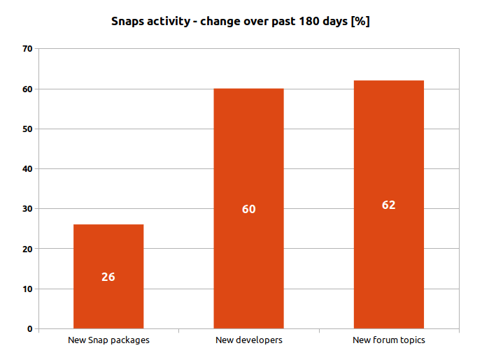 The number of developers has also increased by 60% over the past six months, showing a healthy interest in snaps and their benefits. The interest also manifests in the participation on various online forums, with an increase of about 62% in new topics being discussed on the Snapcraft forum, as well as more activity on Launchpad – and more bugs reported, which is often a good sign. While bugs are not conducive to the user experience, they do show people are interested in seeing problems resolved.