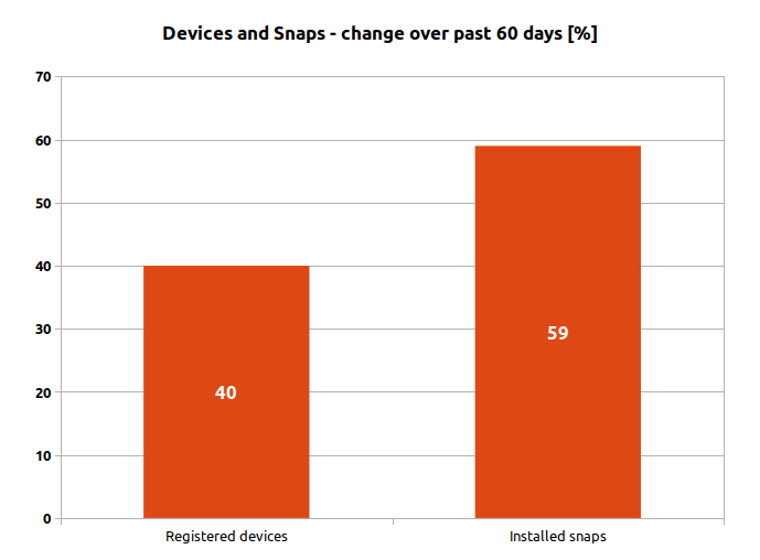 For instance, in the past sixty days, we have seen a 40% increase in the number devices running snaps, but even more importantly, a 59% increase in the number of installed snaps, which shows a growth in snap adoption among Linux users. Over the past six months, the number of devices running snaps has more than trebled.