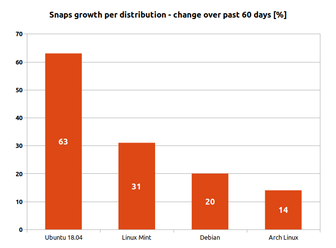 It’s not all Ubuntu, either. For example, taking a small subset of all supported distributions, Linux Mint systems have seen a growth of 31%, Debian systems about 20% to name but two. There is also adoption amongst many other distributions. For instance, Arch-based systems show a solid 14% growth. Today, we have more than 50 distributions using snaps and this is growing steadily.