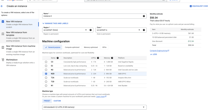 In Google Cloud Console, choose Compute Engine and Create an Instance. Make sure you select N2D machine (AMD EPYC).