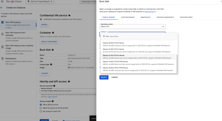 Under Boot disk, select a SEV compatible Operating System, such as Ubuntu 22.04 LTS Pro Server (x86/64, amd64 jammy pro server).