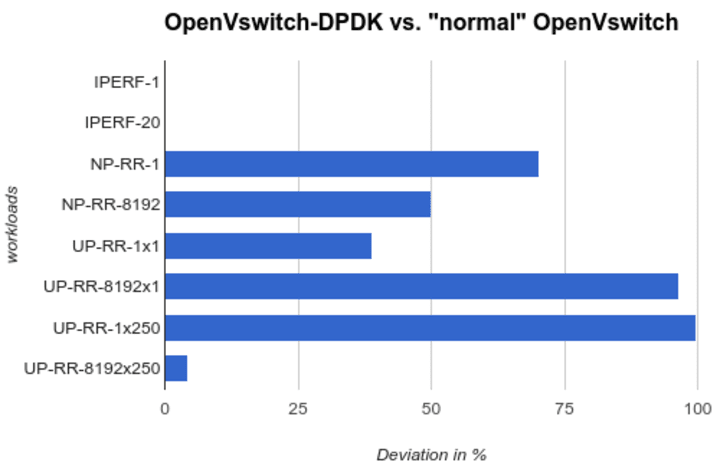 Iperf already saturated the line speed of the card so there was no improvement to be made. But the request and response workloads of netperf and uperf at different sizes and concurrent connection counts show a clear benefit of DPDK in these cases.