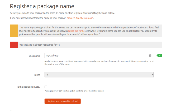 On the name registration page of the store, I’m going to try to register ‘my-cool-app’, which already exists.