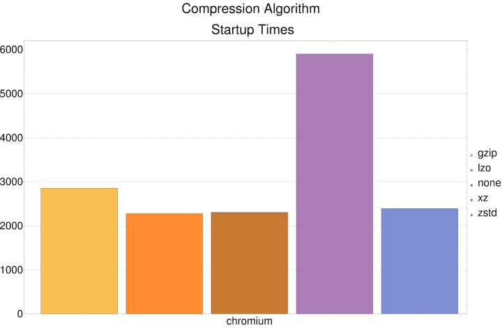 The graph above shows the startup time in milliseconds of the chromium snap, with various different compression algorithms used. All times were averaged across multiple runs from a “cold start” with no caching activated.